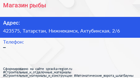 Магазин рыбы по адресу 423575, Татарстан, Нижнекамск, Ахтубинская, 2/6 в дальнейшем Организация, размещена в следующих категориях: