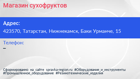 Магазин сухофруктов по адресу 423570, Татарстан, Нижнекамск, Баки Урманче, 15 в дальнейшем Организация, размещена в следующих категориях: