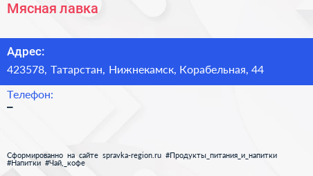 Мясная лавка по адресу 423578, Татарстан, Нижнекамск, Корабельная, 44 в дальнейшем Организация, размещена в следующих категориях: