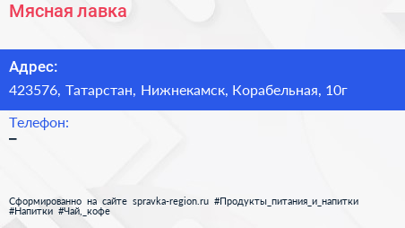 Мясная лавка по адресу 423576, Татарстан, Нижнекамск, Корабельная, 10г в дальнейшем Организация, размещена в следующих категориях: