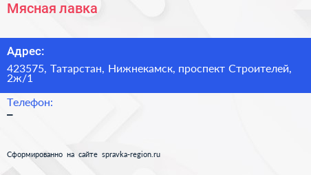Мясная лавка по адресу 423575, Татарстан, Нижнекамск, проспект Строителей, 2ж/1 в дальнейшем Организация, размещена в следующих категориях: