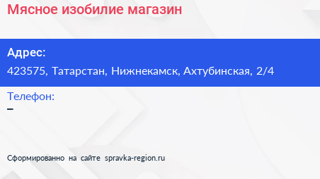 Мясное изобилие, магазин по адресу 423575, Татарстан, Нижнекамск, Ахтубинская, 2/4 в дальнейшем Организация, размещена в следующих категориях: