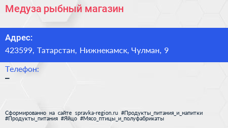 Медуза, рыбный магазин по адресу 423599, Татарстан, Нижнекамск, Чулман, 9 в дальнейшем Организация, размещена в следующих категориях: