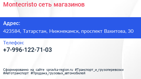 Montecristo, сеть магазинов по адресу 423584, Татарстан, Нижнекамск, проспект Вахитова, 30 в дальнейшем Организация, размещена в следующих категориях: