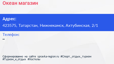 Океан, магазин по адресу 423575, Татарстан, Нижнекамск, Ахтубинская, 2/1 в дальнейшем Организация, размещена в следующих категориях: