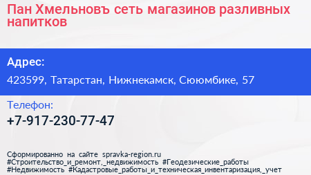 Пан Хмельновъ, сеть магазинов разливных напитков по адресу 423599, Татарстан, Нижнекамск, Сююмбике, 57 в дальнейшем Организация, размещена в следующих категориях: