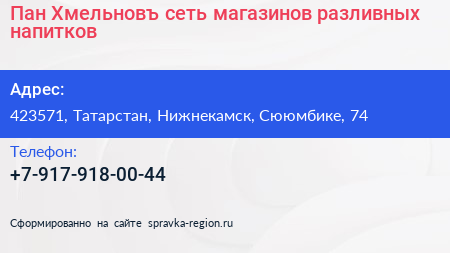 Пан Хмельновъ, сеть магазинов разливных напитков по адресу 423571, Татарстан, Нижнекамск, Сююмбике, 74 в дальнейшем Организация, размещена в следующих категориях: