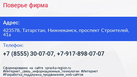 Для связи с организацией воспользуйтесь номером телефона: +7 (8555) 30-07-07, +7-917-898-07-07. Ежедневно с 08:00 до 19:00, вы можете обратиться в эту организацию.