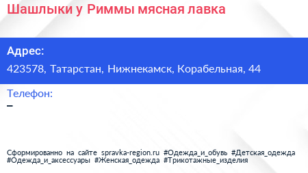 Шашлыки у Риммы, мясная лавка по адресу 423578, Татарстан, Нижнекамск, Корабельная, 44 в дальнейшем Организация, размещена в следующих категориях: