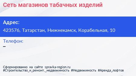 Сеть магазинов табачных изделий по адресу 423576, Татарстан, Нижнекамск, Корабельная, 10 в дальнейшем Организация, размещена в следующих категориях: