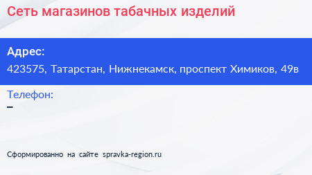Сеть магазинов табачных изделий по адресу 423575, Татарстан, Нижнекамск, проспект Химиков, 49в в дальнейшем Организация, размещена в следующих категориях: