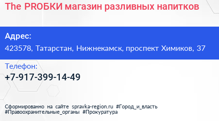 The PROБКИ, магазин разливных напитков по адресу 423578, Татарстан, Нижнекамск, проспект Химиков, 37 в дальнейшем Организация, размещена в следующих категориях: