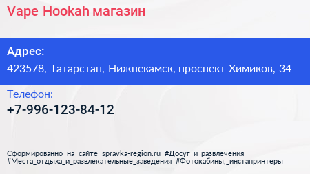 Vape Hookah, магазин по адресу 423578, Татарстан, Нижнекамск, проспект Химиков, 34 в дальнейшем Организация, размещена в следующих категориях: