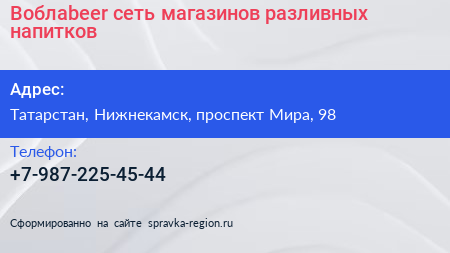 Воблаbeer, сеть магазинов разливных напитков по адресу Татарстан, Нижнекамск, проспект Мира, 98 в дальнейшем Организация, размещена в следующих категориях: