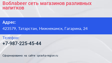 Воблаbeer, сеть магазинов разливных напитков по адресу 423579, Татарстан, Нижнекамск, Гагарина, 24 в дальнейшем Организация, размещена в следующих категориях: