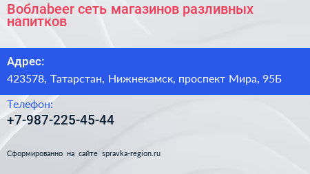 Воблаbeer, сеть магазинов разливных напитков по адресу 423578, Татарстан, Нижнекамск, проспект Мира, 95Б в дальнейшем Организация, размещена в следующих категориях: