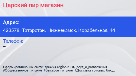 Царский пир, магазин по адресу 423578, Татарстан, Нижнекамск, Корабельная, 44 в дальнейшем Организация, размещена в следующих категориях: