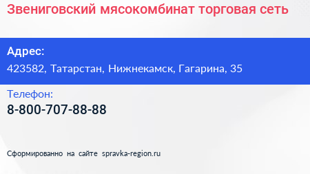 Звениговский мясокомбинат, торговая сеть по адресу 423582, Татарстан, Нижнекамск, Гагарина, 35 в дальнейшем Организация, размещена в следующих категориях: