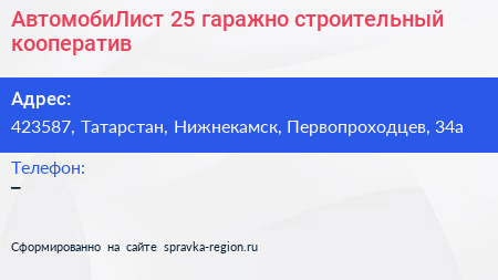 АвтомобиЛист №25, гаражно-строительный кооператив по адресу 423587, Татарстан, Нижнекамск, Первопроходцев, 34а в дальнейшем Организация, размещена в следующих категориях:
