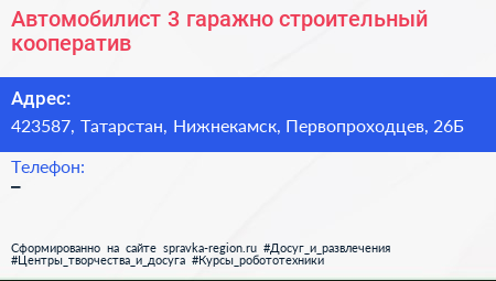 Автомобилист №3, гаражно-строительный кооператив по адресу 423587, Татарстан, Нижнекамск, Первопроходцев, 26Б в дальнейшем Организация, размещена в следующих категориях: