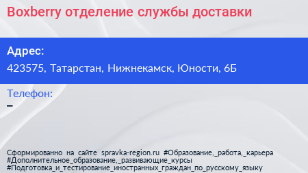 Boxberry, отделение службы доставки по адресу 423575, Татарстан, Нижнекамск, Юности, 6Б в дальнейшем Организация, размещена в следующих категориях:
