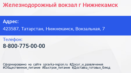 Железнодорожный вокзал, г. Нижнекамск по адресу 423587, Татарстан, Нижнекамск, Вокзальная, 7 в дальнейшем Организация, размещена в следующих категориях:
