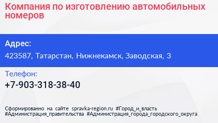 Компания по изготовлению автомобильных номеров по адресу 423587, Татарстан, Нижнекамск, Заводская, 3 в дальнейшем Организация, размещена в следующих категориях: