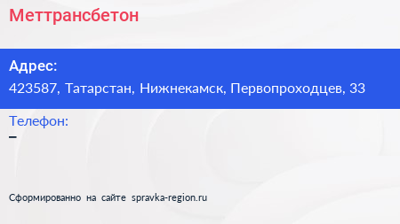 Меттрансбетон по адресу 423587, Татарстан, Нижнекамск, Первопроходцев, 33 в дальнейшем Организация, размещена в следующих категориях: