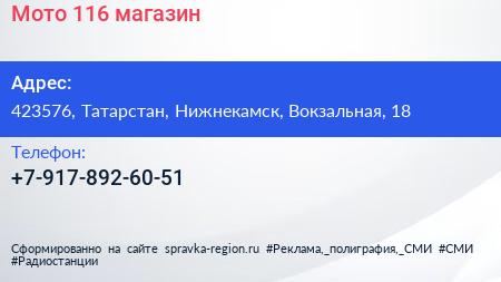 Мото-116, магазин по адресу 423576, Татарстан, Нижнекамск, Вокзальная, 18 в дальнейшем Организация, размещена в следующих категориях: