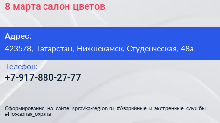 8 марта, салон цветов по адресу 423578, Татарстан, Нижнекамск, Студенческая, 48а в дальнейшем Организация, размещена в следующих категориях: