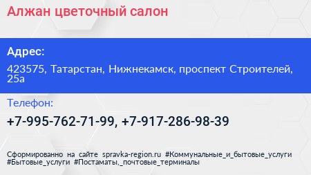 Алжан, цветочный салон по адресу 423575, Татарстан, Нижнекамск, проспект Строителей, 25а в дальнейшем Организация, размещена в следующих категориях: