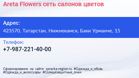Areta Flowers, сеть салонов цветов по адресу 423570, Татарстан, Нижнекамск, Баки Урманче, 15 в дальнейшем Организация, размещена в следующих категориях: