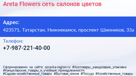 Areta Flowers, сеть салонов цветов по адресу 423571, Татарстан, Нижнекамск, проспект Шинников, 33а в дальнейшем Организация, размещена в следующих категориях: