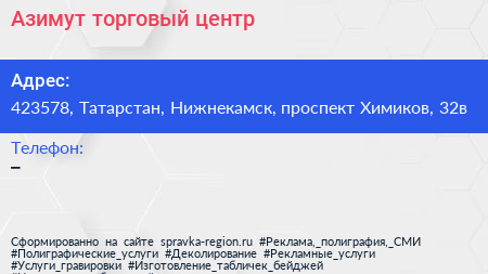 Азимут, торговый центр по адресу 423578, Татарстан, Нижнекамск, проспект Химиков, 32в в дальнейшем Организация, размещена в следующих категориях: