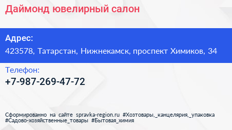 Даймонд, ювелирный салон по адресу 423578, Татарстан, Нижнекамск, проспект Химиков, 34 в дальнейшем Организация, размещена в следующих категориях: