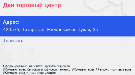 Дан, торговый центр по адресу 423575, Татарстан, Нижнекамск, Тукая, 2а в дальнейшем Организация, размещена в следующих категориях:
