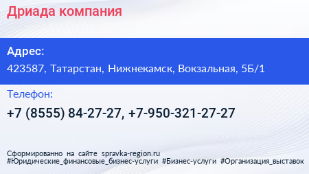 Дриада, компания по адресу 423587, Татарстан, Нижнекамск, Вокзальная, 5Б/1 в дальнейшем Организация, размещена в следующих категориях:
