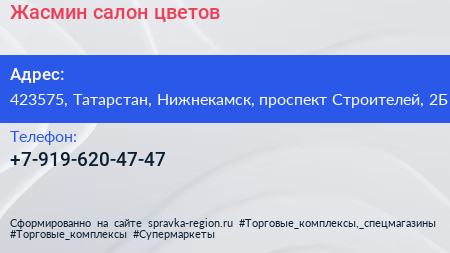 Жасмин, салон цветов по адресу 423575, Татарстан, Нижнекамск, проспект Строителей, 2Б в дальнейшем Организация, размещена в следующих категориях: