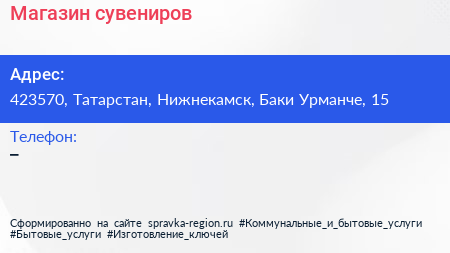 Магазин сувениров по адресу 423570, Татарстан, Нижнекамск, Баки Урманче, 15 в дальнейшем Организация, размещена в следующих категориях:
