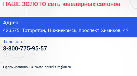 НАШЕ ЗОЛОТО, сеть ювелирных салонов по адресу 423575, Татарстан, Нижнекамск, проспект Химиков, 49 в дальнейшем Организация, размещена в следующих категориях: