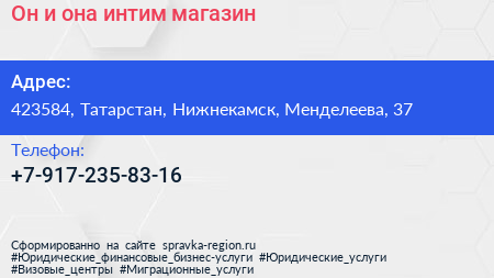 Он и она, интим-магазин по адресу 423584, Татарстан, Нижнекамск, Менделеева, 37 в дальнейшем Организация, размещена в следующих категориях: