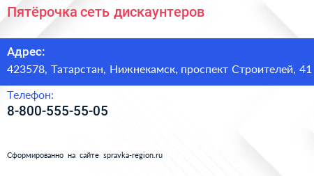 Пятёрочка, сеть дискаунтеров по адресу 423578, Татарстан, Нижнекамск, проспект Строителей, 41 в дальнейшем Организация, размещена в следующих категориях: