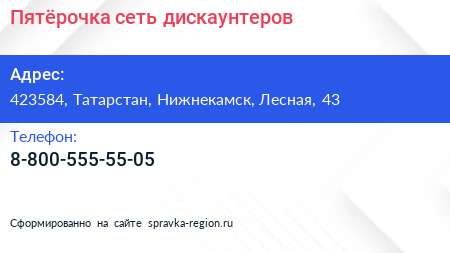 Пятёрочка, сеть дискаунтеров по адресу 423584, Татарстан, Нижнекамск, Лесная, 43 в дальнейшем Организация, размещена в следующих категориях: