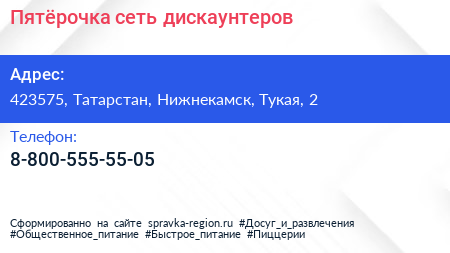 Пятёрочка, сеть дискаунтеров по адресу 423575, Татарстан, Нижнекамск, Тукая, 2 в дальнейшем Организация, размещена в следующих категориях: