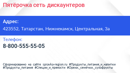 Пятёрочка, сеть дискаунтеров по адресу 423552, Татарстан, Нижнекамск, Центральная, 3а в дальнейшем Организация, размещена в следующих категориях: