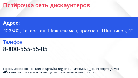 Пятёрочка, сеть дискаунтеров по адресу 423582, Татарстан, Нижнекамск, проспект Шинников, 42 в дальнейшем Организация, размещена в следующих категориях:
