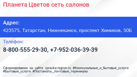 Планета Цветов, сеть салонов по адресу 423575, Татарстан, Нижнекамск, проспект Химиков, 50Б в дальнейшем Организация, размещена в следующих категориях: