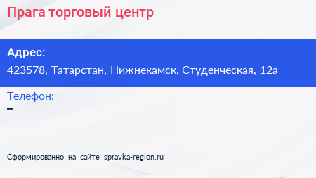 Прага, торговый центр по адресу 423578, Татарстан, Нижнекамск, Студенческая, 12а в дальнейшем Организация, размещена в следующих категориях:
