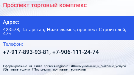 Проспект, торговый комплекс по адресу 423578, Татарстан, Нижнекамск, проспект Строителей, 47Б в дальнейшем Организация, размещена в следующих категориях: