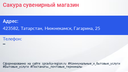 Сакура, сувенирный магазин по адресу 423582, Татарстан, Нижнекамск, Гагарина, 25 в дальнейшем Организация, размещена в следующих категориях: